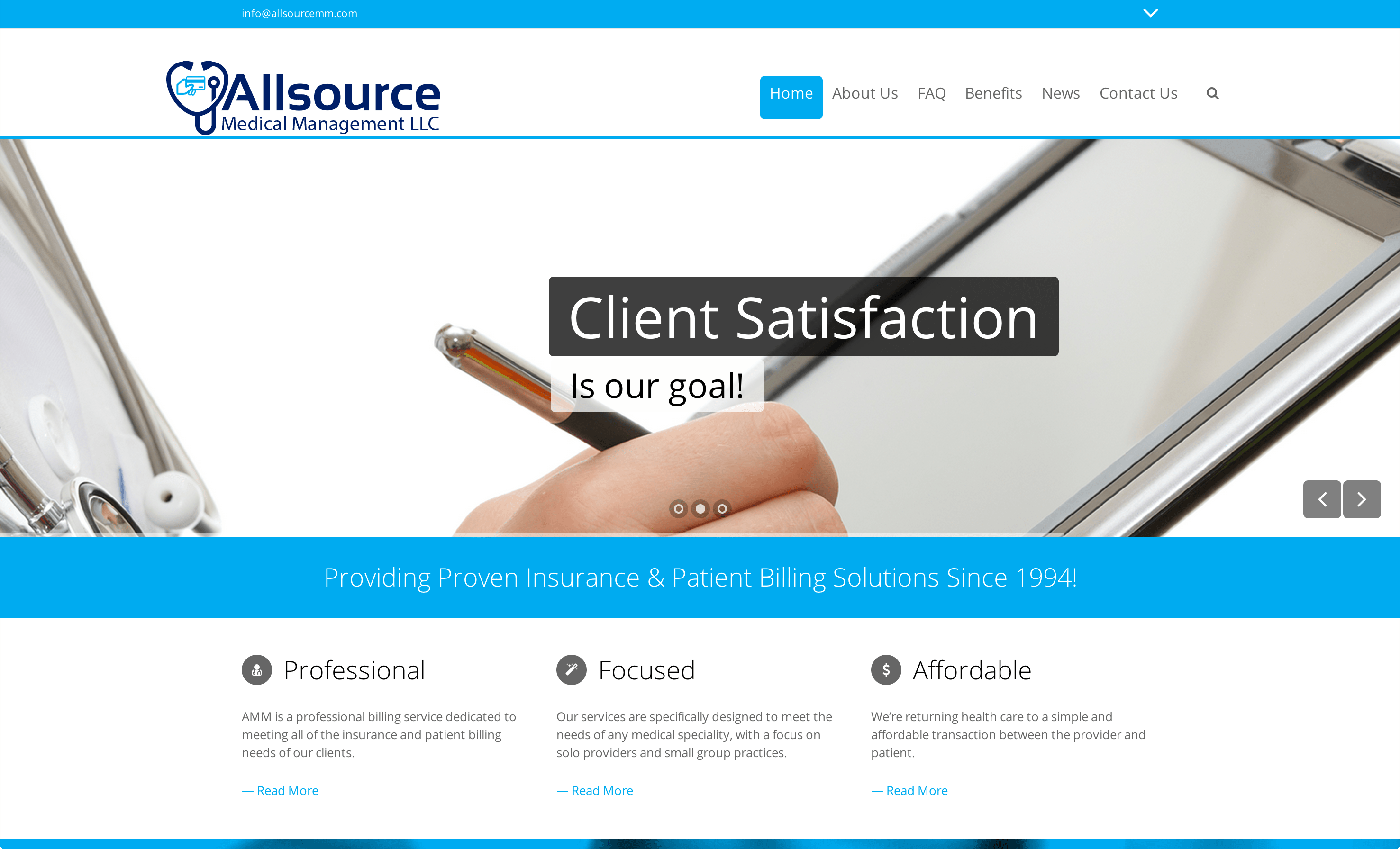 For Allsource Medical Management, LLC., we did a complete custom WordPress design and development using state of the art framework with a professional and clean design. We also designed their logo as well as some other custom graphics.